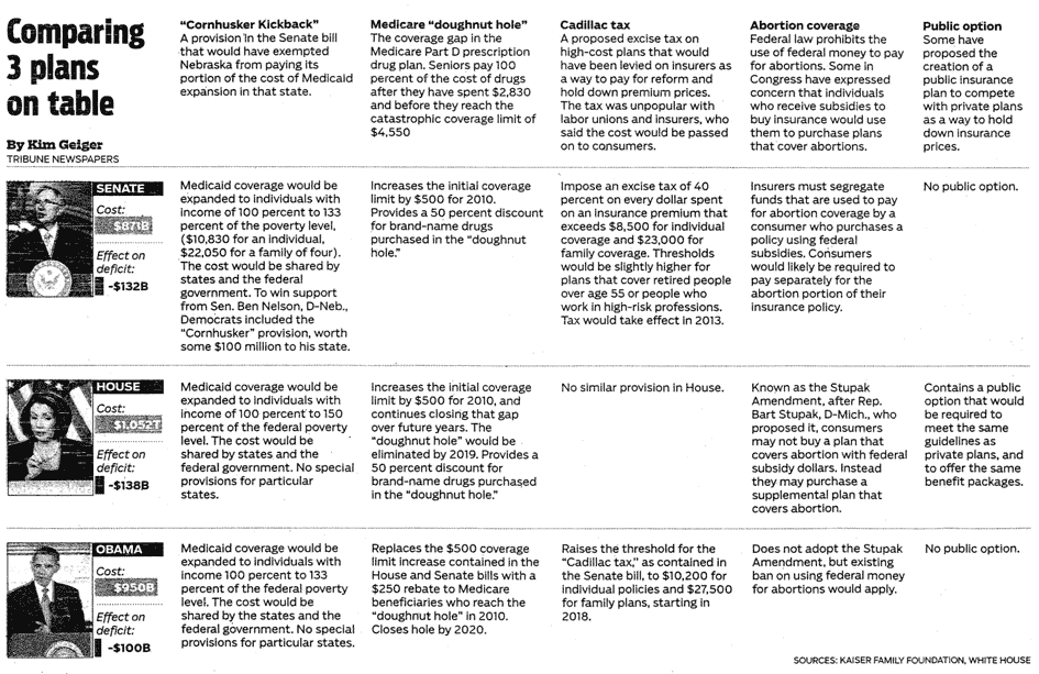 Charts comparing the three plans from The New York Times and The Chicago Tribune are below.
