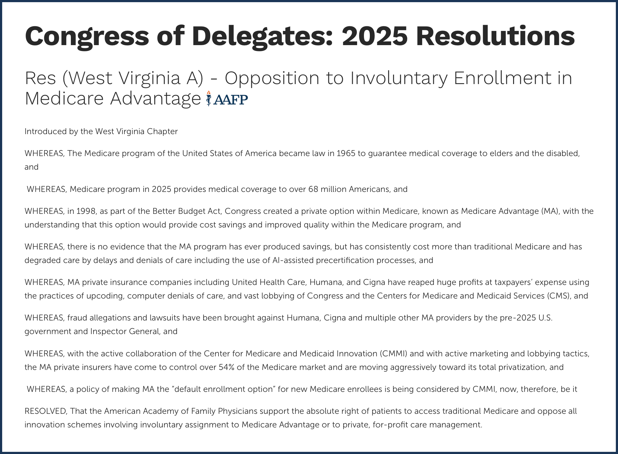 This resolution was adopted unanimously by the West Virginia Academy of Family Physicians Board in April 2025, and was sent to the American Academy of Family Physicians for consideration at their October 2025 national conference.