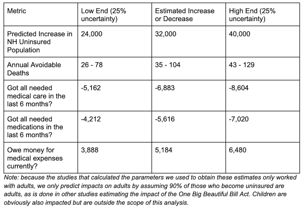 Health economists like author Thomas Lane have studied the link between health insurance and health outcomes. Their work allows us to estimate how many more preventable deaths may occur as health insurance coverage declines, among other outcomes. For example, in a study called the Oregon Health Insurance Experiment, a lottery was run for people on a waiting list to join Medicaid, and the outcomes of those selected were followed over time and compared to those not selected. By combining the results of studies like these with KFF’s projection of the number of Granite Staters who will lose their health insurance due to the OBBBA and related policy changes, Thomas can project its health impacts.