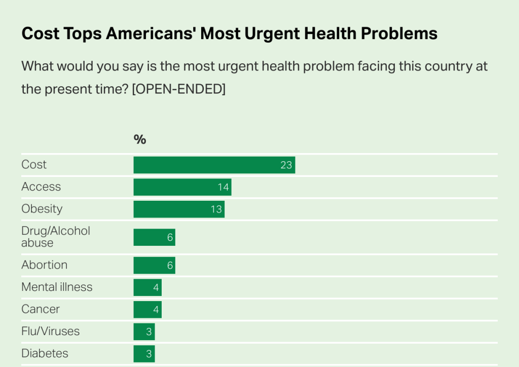 An open-ended question measuring Americansā views of theĀ most urgent health problemĀ facing the country finds that two issues related to the healthcare system ā cost (23%) and access (14%) ⦠are mentioned most often.