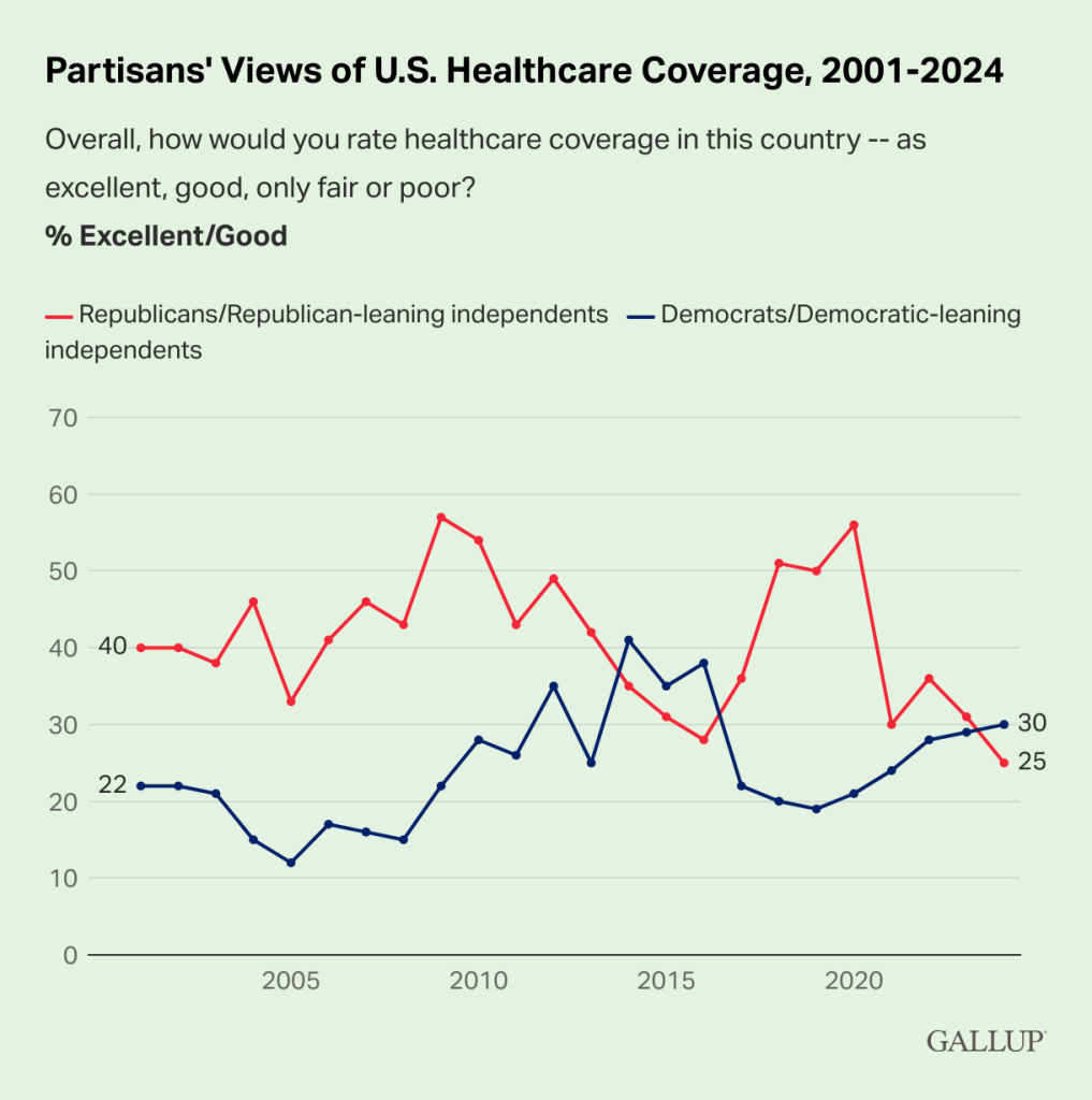 Evaluations of U.S. healthcareĀ qualityĀ among Republicans ⦠are down sharply since President Donald Trump left office in 2021. Currently [late 2024], 42% of Republicans and Republican leaners rate healthcare quality positively, compared with 65% to 68% from 2017 to 2020. ā¦